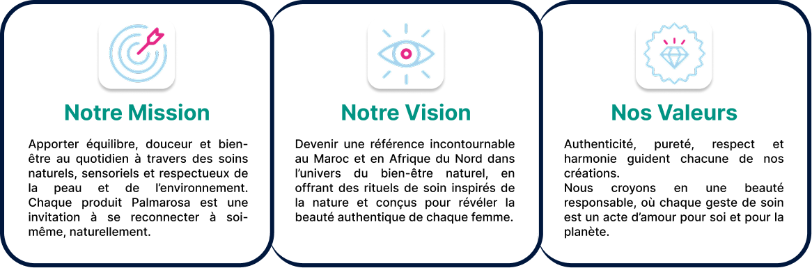 Fondée en 2012 à Casablanca par LAALJ MOUNA, experte en cosmétique et esthétique, Palmarosa est le premier concept de parfumerie et parapharmacie au Maroc, avec pour mission de rendre la beauté plus simple, plus accessible et plus inspirante. Le nom Palmarosa incarne la joie, la confiance, la douceur… et la vie en rose.